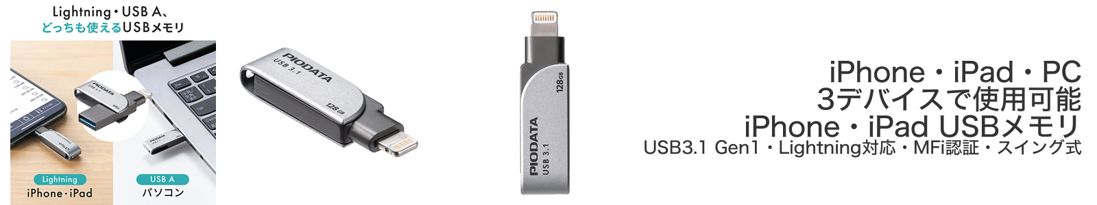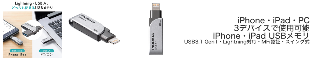 この製品は、片側にLightningコネクタ、もう片側にUSB Aコネクタを備えたスイング式のUSBメモリである。